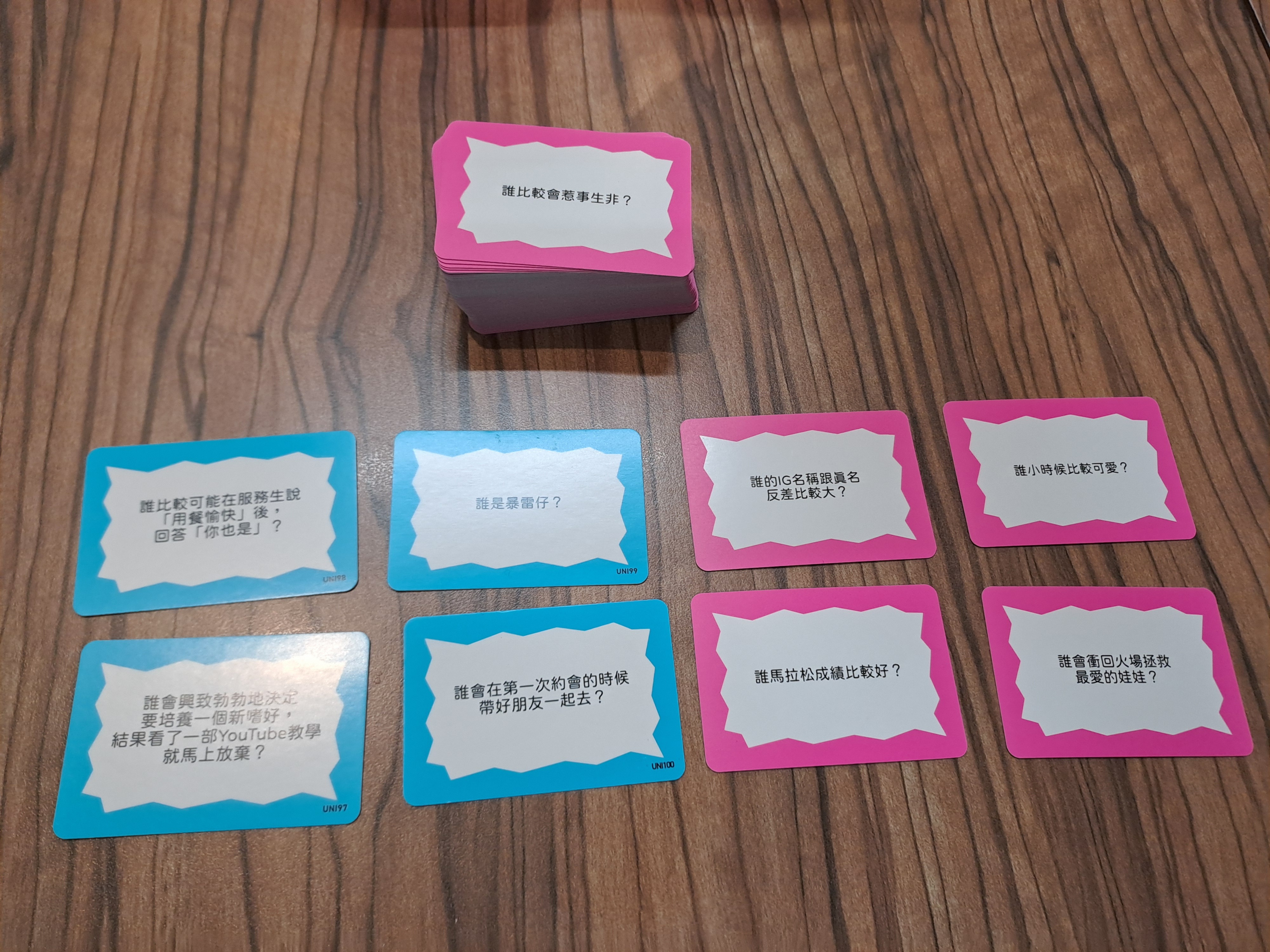 從兩位拿到1號的玩家開始組成隊伍,其他玩家抽兩張題目卡